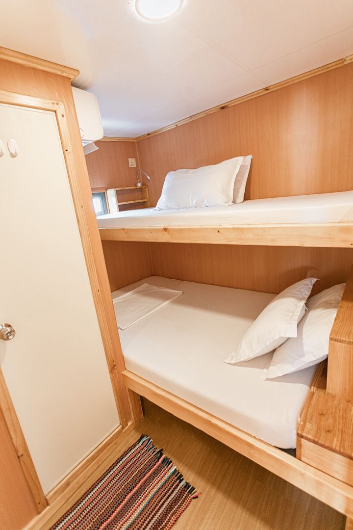 The MV Misraab was completely renovated in 2021 and is a well-maintained, comfortable vessel where you will quickly feel at home. On board, there are four air-conditioned double cabins, each with a private bathroom. The cabins are equipped with bunk beds and are simply yet practically furnished.